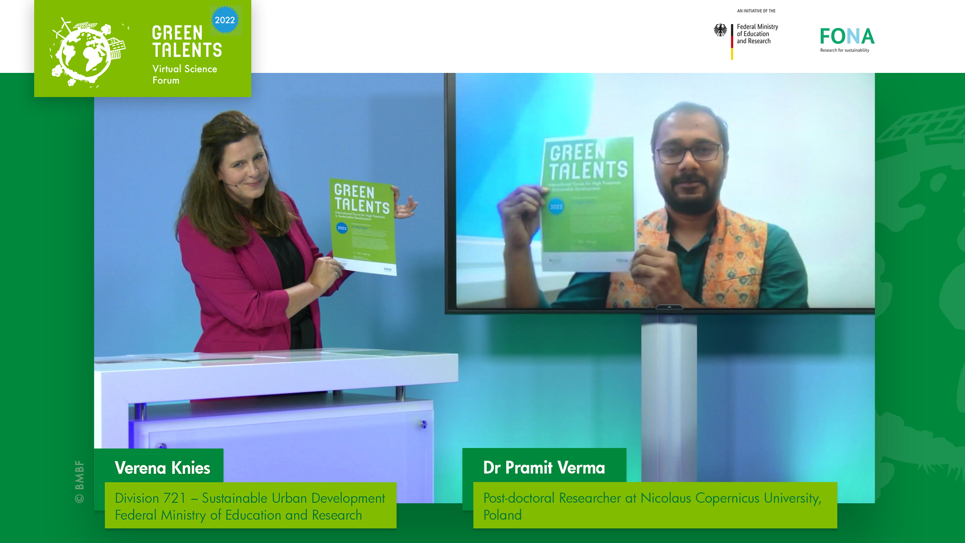 At the conclusion of the Virtual Science Forum, the Federal Ministry of Education and Research honoured the Green Talents 2022 at a Virtual Award Ceremony on Thursday, 27 October 2022. Moderator Andrea Thilo led through a varied and diverse programme, ending with the virtual presentation of the certificates to the Green Talents 2022, who are spread across the world in different time zones.